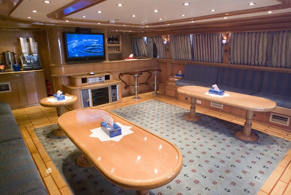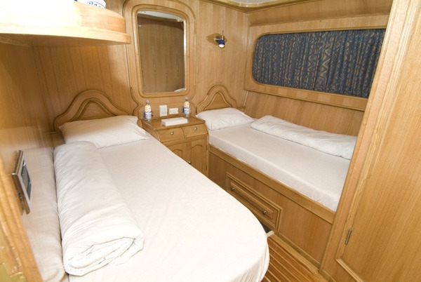 Cyclone is 32m from bow to stern and her sturdy wood hull is a stable home away from home. 20 divers can be easily accommodated over 10 twin cabins. For your complete comfort, all of the cabins are en suite, have individual air con and plenty of space to stow your belongings for the week. There are 2 twin cabins on the main deck, 6 twin cabins below decks and 2 bow cabins which have bunks. All cabins are pre-allocated at the time of booking.