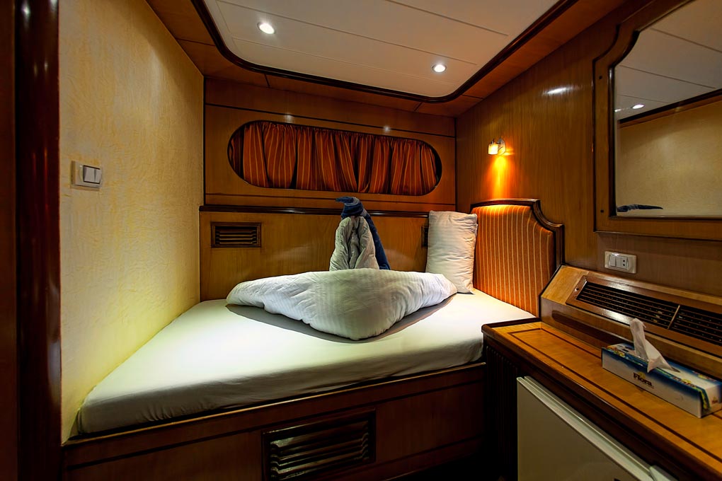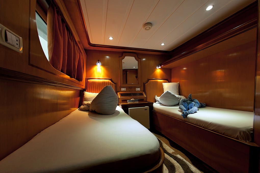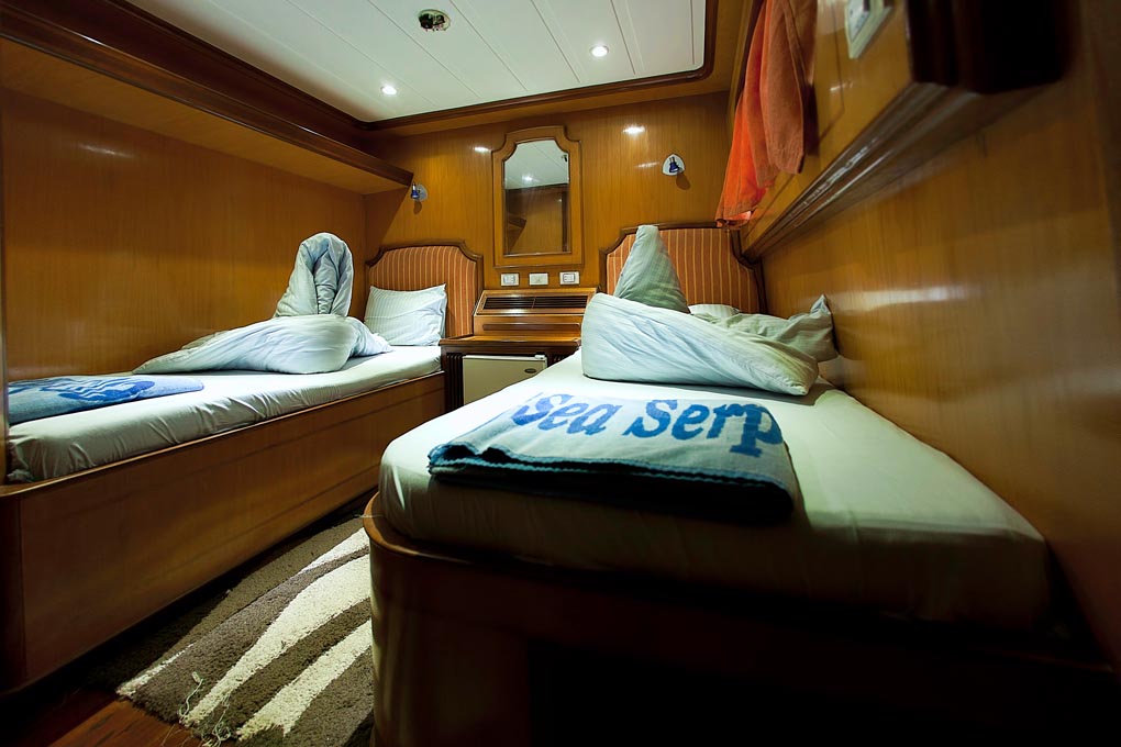 M/Y Grand Sea Serpent’s length is an impressive 41 meters and she counts 2 suites and 10 cabins among her accommodations with all the facilities you would expect when traveling on a top-class liveaboard; music, fridge and ensuite bathroom are standard in all cabins. The large bathrooms all feature multiple jet showers.