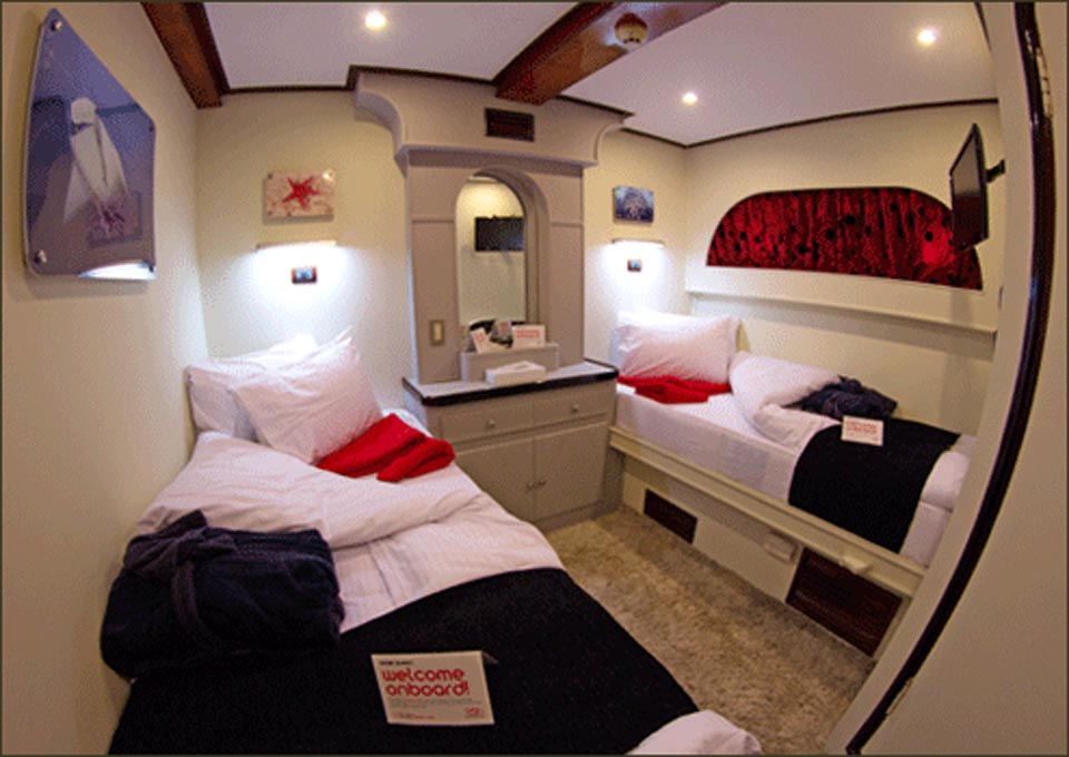 At 32 metres long with 12 cabins divided over three decks, M/Y Red Sea Adventurer is an ideal choice for smaller full charter groups. There are eight comfortably appointed twin cabins, two double cabins and two single cabins providing accommodation for 22 guests (24 in special circumstances). All cabins benefit from en-suite facilities, air conditioning and in-cabin entertainment.