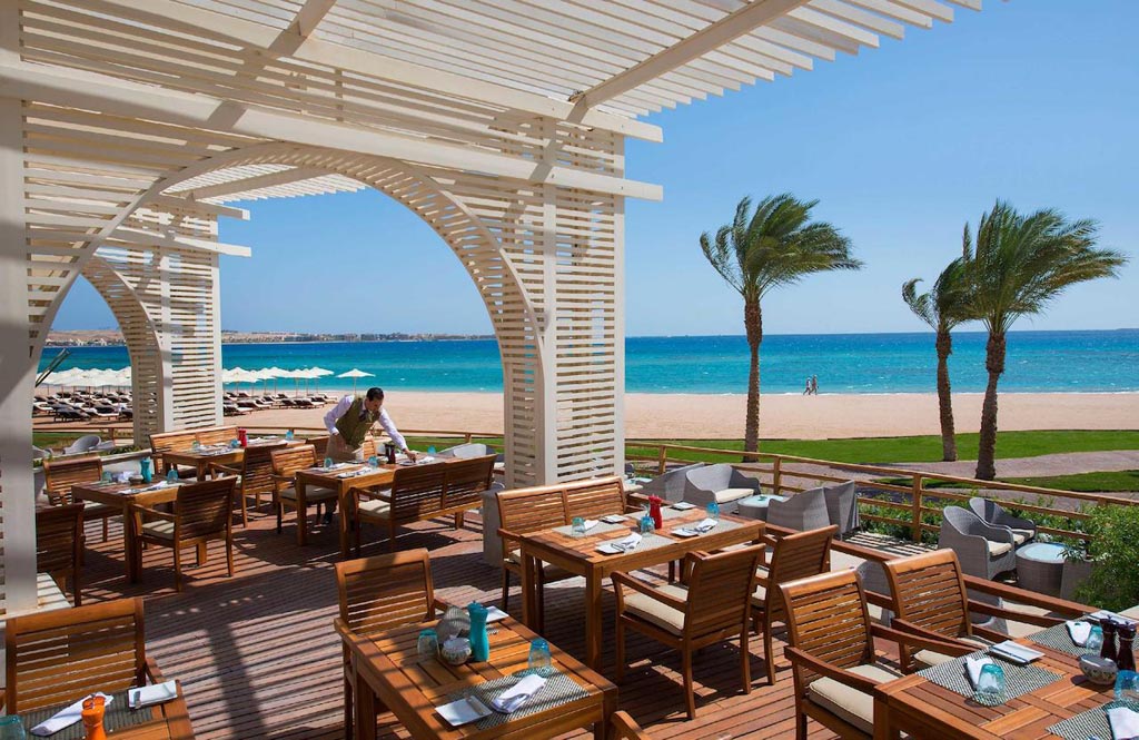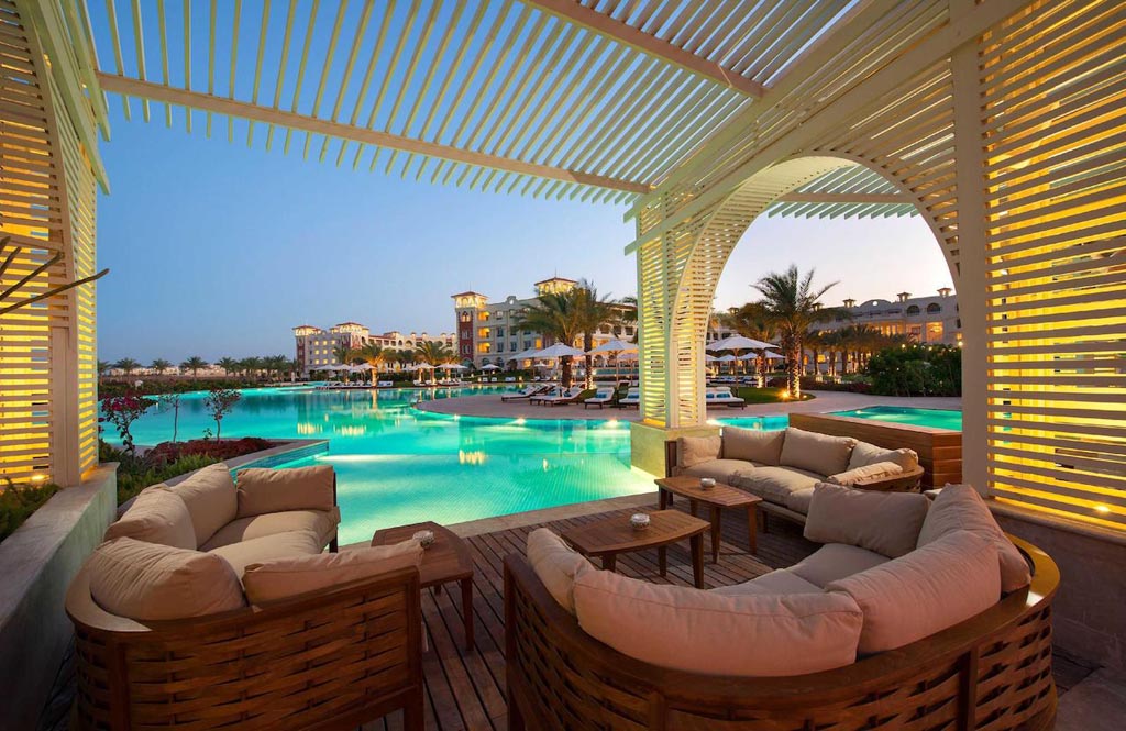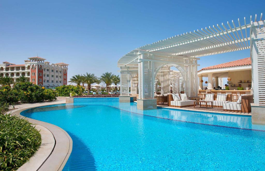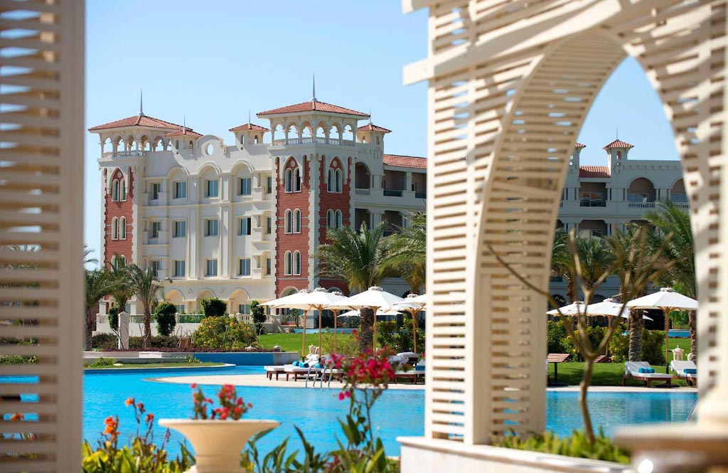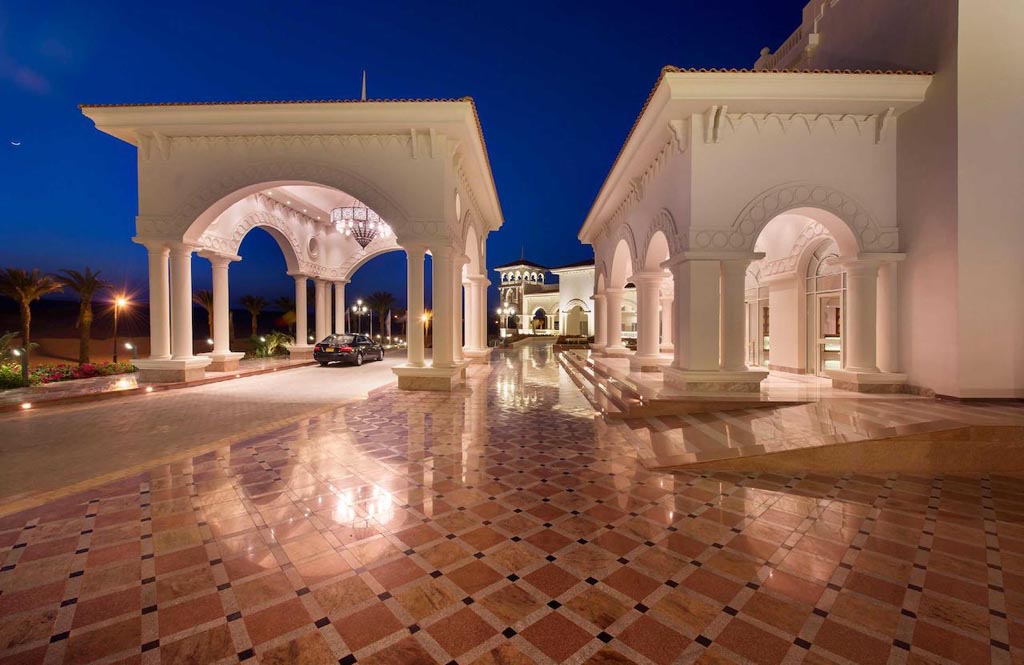 The Baron Palace Resort is beautifully and ideally located in the heart of Sahl Hasheesh Bay, a new 41 million sq.m promising destination, which is 17 km south of Hurghada International Airport; the Resort itself is 20 km away from downtown Hurghada. Sahl Hasheesh is famed for its world-wonder natural treasures, ultimate geographic beauty that Mother Nature bestowed, historic features built through the years by different inhabitants, leaving behind the told and untold stories for the visitors to unfold, and man-made miracles including; the Main Gate, the Old Town, the Sunken City, the International Marina, and the Boardwalk. Baron Palace Resort Sahl Hasheesh, a six-star hotel, is a secluded haven impeccably landmarked on 100,000 sq.m on the coast of the legendary breathtaking diving and snorkeling paradise of the Red Sea waters, 80,000 sq.m (80% of the total land area) of which, are occupied by a blend of luscious landscape edged by mega-sized palm trees and evergreen vegetation. The front scene of the Hotel, extending on over 600m of private sandy beach, privileges rooms and public areas with an exception full sea view, bright sunlit interiors and sunset scenery. On the backdrop are miles of serene unspoiled desert and mountains. The unsurpassed classic Mediterranean architectural flair of this amazing Resort is inspired by some of the most stunning Arabian palaces, surrounded by flourishing luxuriant gardens and shimmering blue infinitive pools, blending the splendors of history with the comforts of modern amenities, and creating an oasis of tranquility to relieve the stresses and welcome the guests. The interiors are designed with an oriental theme of style and elegance, with impressive patterns and the most precious materials to decorate the Hotel. At the entrance, a traditional Arabic courtyard (sahn), offers a luxurious feeling of space enriched by fine materials. To tie in with the Egyptian style, beautiful mashrabiya panels are incorporated. In the main hall entirely facing the stunning open views of the bay, grand circular staircases lead up to the first floor, giving the space glamour and a regal value. The impressive dimensions of the lobby and public areas surrounding the guests as they linger, harmonize these finishes beautifully, leaving the guests with a feeling of magnificence and comfort.