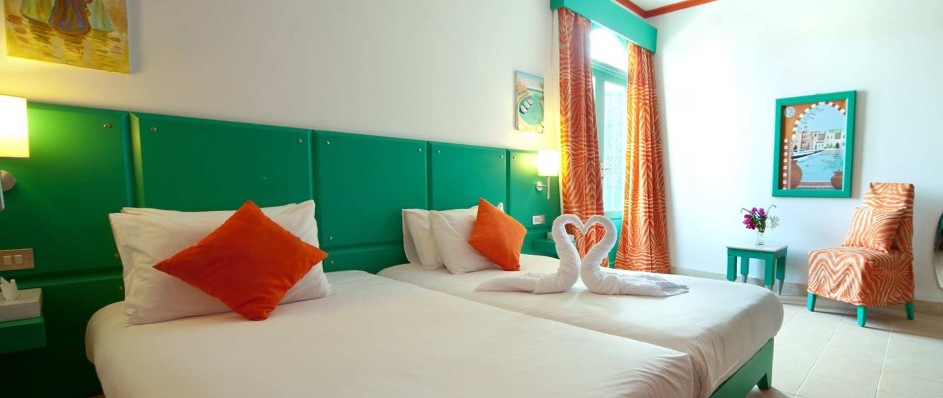 Turtle’s Inn welcomes active holidaymakers and partygoers in 27 cheerful rooms decorated in bright colors that boast a refreshingly unique style. The simple but comfortable accommodations of this intimate hotel come with modern amenities. Guests also have access to the swimming pools of Ali Pasha Hotel, one of which is heated in the winter, and to the sandy beach of Moods Beach Club a few steps away. Turtle’s Inn offers the perfect setup to enjoy fantastic vacations in one of the most beloved Red Sea hotels.